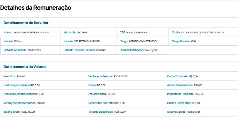 Certamente a austeridade pensada pelo Presidente tenha a ver com a garantia do salário de sua esposa, Larisa Mayara Pereira da Silva, que recebeu no mês de agosto um salário de R$ 20.710,00 dos cofres públicos —valor significativo para um município que enfrenta inadimplência, bloqueios judiciais, falta de água em comunidades, remédios escassos nos hospitais, e veículos públicos sendo retomados por locadoras por falta de pagamento: